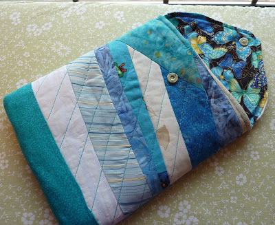 I used them to cut out a solid piece (for the lining) and then string pieced on the pattern templates until they were all covered.  It was fun to dig all the blues and creamy whites out of my scrap bin.
