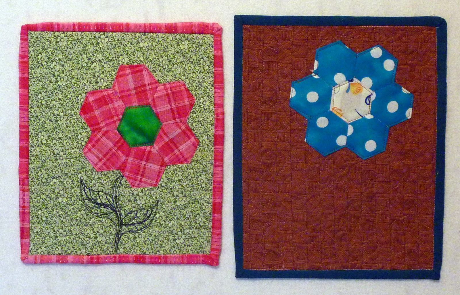 This year I decided to make mug rugs for them.  I was trying to decide on some simple pretty patchwork when my eye fell on some grandmother's flower garden blocks pinned to my wall.  They've been sitting there since April when I first learned English paper piecing and I'd not decided what to do with them.  You may recall them being an item on my summer UFO list!  Anyway, several are still there but I thought these two made cute and colorful mug rugs.