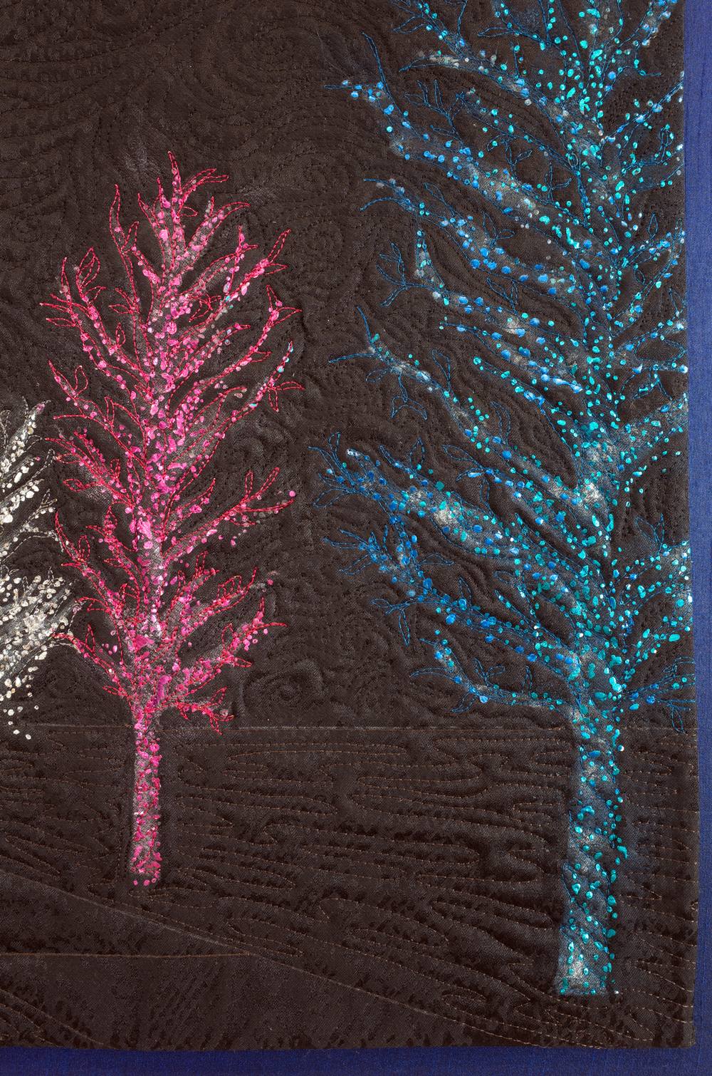 I worked slightly bigger this time, but used more or less the same approach as before. The first layer is shiva paintsticks to sketch in the tree (using freezer paper stencils). Then I screened/stenciled the foiling glue on. This time I just used regular tacky glue and it worked fine for the screen and foil, although it was quite sticky and two prints was about all I could get out of it. I did figure that I might as well make at least two of them since I went to all the trouble to cut the screens/stencils again. The quilts finished at ~12 x 16 but I decided to mount them on fabric-wrapped 14 x 18 canvases. I think it gives a bit more presence for a small quilt and certainly makes them easier to hang. I love that the black fabric I chose has some pattern in it, it's almost like some sort of black-on-black brocade weave, so there's some variation in the color of the background.
