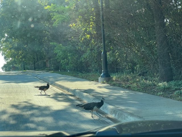 We also saw wild (feral?) peacocks in the street-- apparently there's a population of them that just live loose in Flower Mound! Don't worry, Becky was driving when I took the picture.